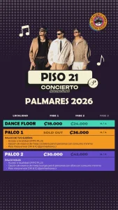 Piso 21 se presentará el domingo 25 de enero cerrando el recital que arrancará partir de las 12:00 mediodía y que servirá como clausura musical de las Fiestas de Palmares 2026. Además, se ha liberado la lista de artistas costarricenses que estarán en el festival. (Toledo & djp, La Kuarta, El Guato, Johnny Man, ShelDixon, Luyah, Chuz And Owner, Dj Criss).